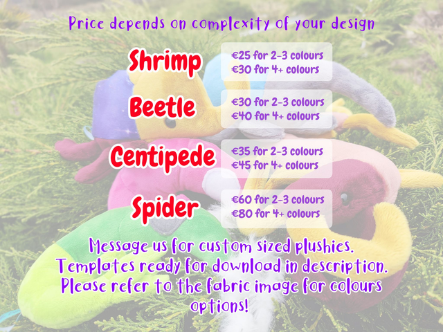 Prices are deducted depending on how many colours you'd like your plushie to be. If you'd like a different size of the plushie, feel free to contact us for a quote!